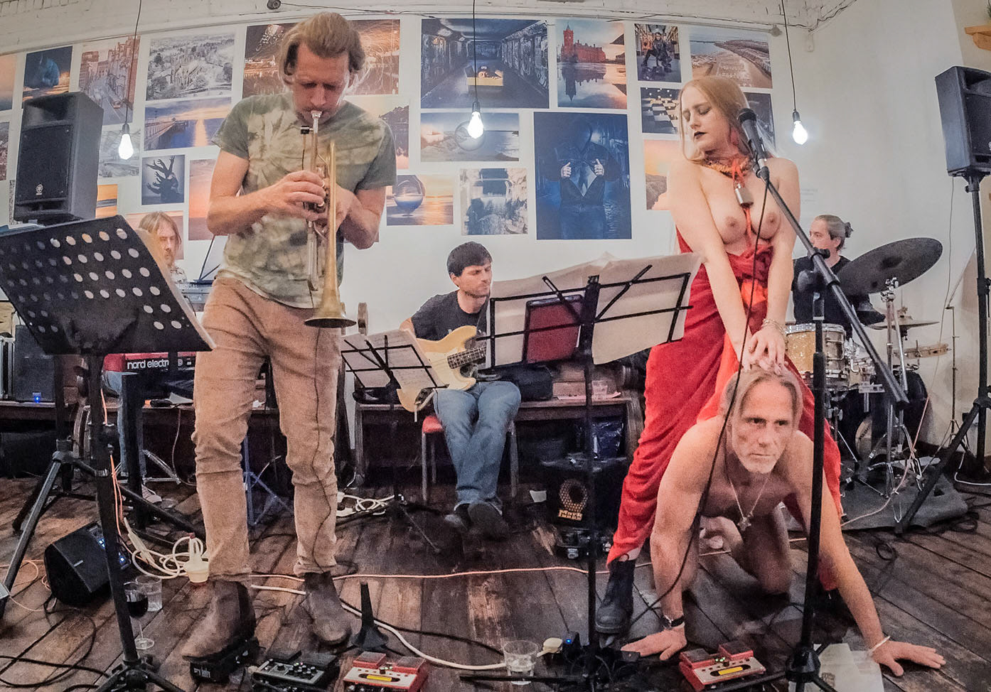 Thomas & Muse is a collaboration between trumpeter Ben Thomas and artist Lucy Muse. Their latest project 'Exposure Enclosure' is an immersive naked performance of music and art which invites the audience to experience proceedings in a clothing-optional environment.